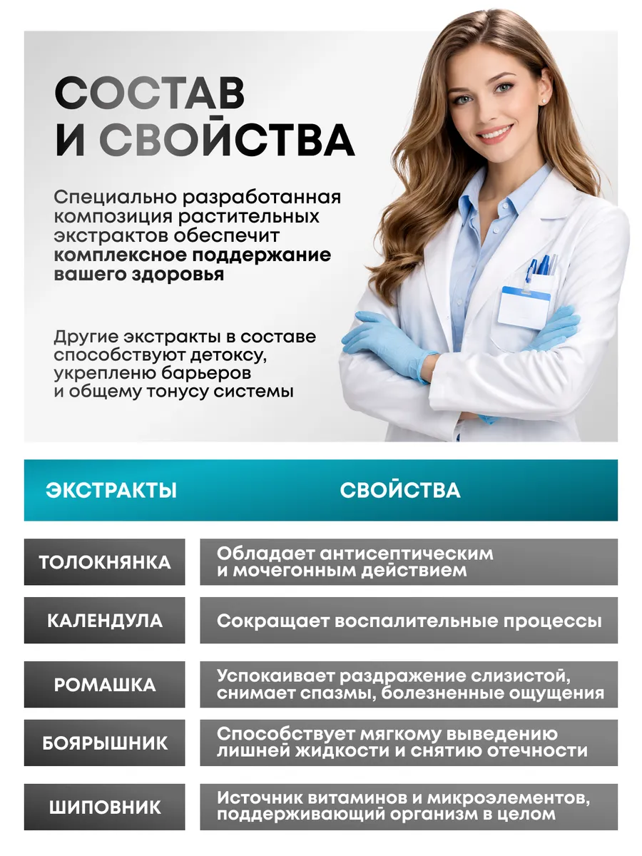 В составе проверенные компоненты (тыква, золототысячник, хвощ, крапива и др.), которые имеют противовоспалительное, спазмолитическое и укрепляющее действие. Многие пациенты отмечают снижение позывов и подтеканий уже через 2–3 недели, особенно если сочетают приём с упражнениями Кегеля. Побочных эффектов практически нет, что делает его безопасным для длительного применения.
